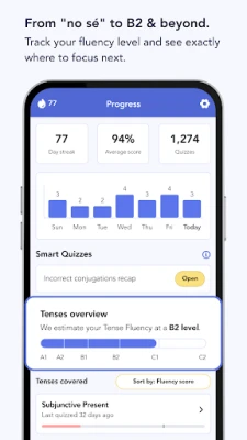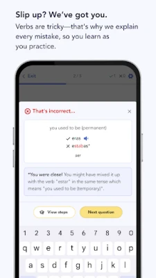 Ella Verbs محض ایک ایپ نہیں، بلکہ ہسپانوی فعل کی مہارت حاصل کرنے کا ایک واضح اور منظم راستہ ہے۔ اس کا طریقہ کار آسان ہے: تصور سیکھیں، مشق کریں جب تک کہ سمجھ میں نہ آجائے، پھر اگلے درجے پر بڑھیں۔ صفر سے شروع کرتے ہوئے، آپ پچاس منظم سطحوں میں مہارت حاصل کریں گے، جو موجودہ زمانے سے لے کر "سبجنکٹیو" تک کا احاطہ کرتی ہیں۔ اس کی ذہین کوئزز آپ کی کمزوریوں کو پہچانتی اور ان پر توجہ مرکوز کرتی ہیں، تاکہ آپ ہمیشہ وہی مشق کریں جو آپ کو درکار ہے۔ سیکھنے والے اس کے نتائج سے متاثر ہیں، جس کا ثبوت اس کی 4.9 ستاروں کی متاثر کن درجہ بندی اور 12,500 سے زیادہ مثبت جائزے ہیں۔