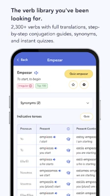 Ella Verbs کے ساتھ، آپ 18 زمانوں کا احاطہ کرنے والے 50 مختصر اسباق اور کوئزز تک رسائی حاصل کرتے ہیں۔ 2,300 سے زیادہ فعل مکمل انگریزی ترجمہ، مترادفات اور مرحلہ وار صرفی رہنمائی کے ساتھ دستیاب ہیں۔ اپنی پیشرفت کا مشاہدہ CEFR سطح کی ٹریکنگ کے ساتھ کریں، جو A1 سے C2 تک آپ کی صحیح پوزیشن بتاتی ہے۔ چاہے آپ ٹائپنگ، کثیر انتخابی سوالات، فلیش کارڈز، سن کر، بول کر، یا جملوں کے سیاق و سباق میں مشق کرنا چاہیں، یہ آپ کو لچک فراہم کرتا ہے۔ "ser بمقابلہ estar" جیسے مشکل موضوعات پر تفصیلی اسباق بھی شامل ہیں۔ یہ ایپ سیکھنے والوں کی ضروریات کو سمجھتے ہوئے جین اور برائن نے خود بنائی ہے، جو اسپین میں رہنے والے ایک آئرش جوڑے ہیں۔ وہ باقاعدگی سے اپڈیٹس جاری کرتے ہیں اور ہر ای میل کا ذاتی طور پر جواب دیتے ہوئے، اپنے صارفین سے گہرا تعلق برقرار رکھتے ہیں۔ آپ اپنی مرضی کے مطابق کوئزز بھی بنا سکتے ہیں اور اپنی مشق کے لیے فعل کی فہرستیں بھی تیار کر سکتے ہیں۔