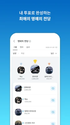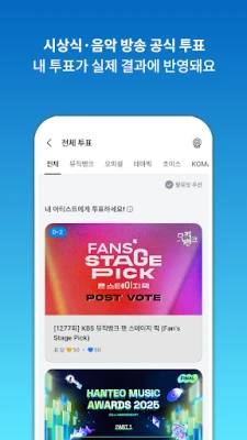 کے-پاپ کی دنیا میں اپنے فنکاروں کی کامیابی میں براہ راست حصہ لیں۔ FANCAST آپ کو KBS Music Bank کی آفیشل پری-ووٹنگ میں حصہ لینے، اور FAN'S STAGE PICK کے ذریعے اپنے پسندیدہ فنکار کو Music Bank کی ٹرافی جتوانے کا موقع فراہم کرتا ہے جو 100% مداحوں کے ووٹوں پر منحصر ہے۔ اس کے علاوہ، KGMA (Korea Grand Music Awards)، Hanteo Music Awards 2025، اور Jupiter Music Awards جیسے باوقار ایوارڈز کے لیے بھی آپ اپنے ووٹ کاسٹ کر سکتے ہیں۔ Ilgan Sports کے تعاون سے FANCAST Theme Pick میں شامل ہوں، IS Weekly Chart اور Monthly Rankings کو متاثر کریں، اور حقیقی وقت کے نتائج دیکھ کر اپنے فنکار کی فتح کا جشن منائیں۔