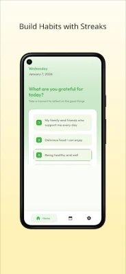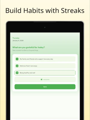آپ کی شکر گزاری کی عادت کو پروان چڑھانے کے لیے یہ ڈیجیٹل ساتھی نہایت سوچ سمجھ کر ڈیزائن کیا گیا ہے۔ آپ اپنی روزانہ کی تین شکریات کو آسانی کے ساتھ درج کر سکتے ہیں اور پھر انہیں ایک منظم اور بصری طور پر دلکش کیلنڈر پر دوبارہ دیکھ سکتے ہیں۔ روزانہ کی یاد دہانیاں اس بات کو یقینی بناتی ہیں کہ آپ کبھی بھی یہ اہم عمل فراموش نہ کریں، جبکہ ایکٹیویٹی اسٹریک ٹریکنگ آپ کو ایک مستقل عادت بنانے میں مدد دے گی اور آپ کی ترقی اور کامیابی کو نمایاں طور پر ظاہر کرے گی۔ اس کے علاوہ، دستیاب مختلف رنگین تھیمز آپ کے تجربے کو مزید ذاتی اور پرلطف بناتے ہیں۔