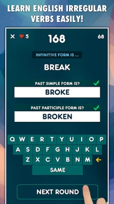 Irregular Verbs Test PRO کے ساتھ انگریزی کے بے قاعدہ افعال تیزی سے سیکھیں۔ انفینیٹو، سمپل پاسٹ، اور پاسٹ پارٹیسیپل فارمز کو دلچسپ ٹائمڈ ٹیسٹ یا آرام دہ پریکٹس کے ذریعے مہارت حاصل کریں۔ جامع تعلیم کا بہترین ذریعہ۔