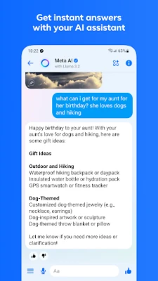 Meta AI، آپ کا ذاتی معاون، فوری جوابات فراہم کرتا ہے، مفید مشورے دیتا ہے، ہوم ورک میں مدد کرتا ہے، اور آپ کی تخلیقی صلاحیتوں کو بڑھاتا ہے۔ Meta AI کے ساتھ تصاویر بنائیں، ترمیم کریں اور انہیں متحرک شکل دیں۔ اپنے پسندیدہ تخلیق کاروں کے اندرونی حلقے کا حصہ بننے کے لیے ان کے براڈکاسٹ چینلز میں شامل ہوں اور مستند مواد سے باخبر رہیں۔ اپنی چیٹس میں جان ڈالنے کے لیے متحرک سٹیکرز، GIFs، اور مختلف ری ایکشنز کا استعمال کریں۔ اپنے مزاج کے مطابق چیٹ کو اپنی پسندیدہ تھیمز سے سجائیں جن میں مقبول فنکار اور تہوار شامل ہیں۔
