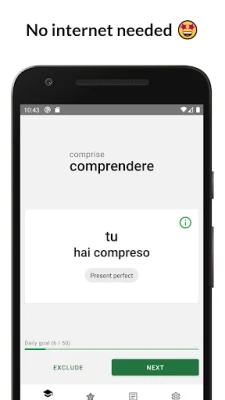 ابتدائی طور پر، یہ ایپ 110 ضروری افعال اور دو کلیدی زمانوں — حال (Present) اور ماضی بعید (Passato Remoto) — کے ساتھ سیکھنے کا ایک مفت تجربہ فراہم کرتی ہے۔ جو لوگ اطالوی فعل کے صرف و نحو پر مکمل مہارت حاصل کرنا چاہتے ہیں، وہ ایک اندرونی خریداری کے ذریعے پرو ورژن کو غیر مقفل کر سکتے ہیں۔ پرو ورژن میں 500 سے زیادہ افعال اور تمام 15 گرامر کے زمانے شامل ہیں، جو آپ کو ایک جامع اور مکمل سیکھنے کا راستہ فراہم کرتے ہیں۔ یہ یقینی بناتا ہے کہ آپ اطالوی زبان کے ہر پہلو کو گہرائی سے سمجھ سکیں اور ان پر عبور حاصل کر سکیں۔ یہ ایپ فونز اور ٹیبلٹس دونوں پر بغیر کسی کسی رکاوٹ کے کام کرتی ہے۔